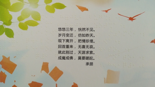 感謝所有為“盲文畢業(yè)紀念冊”做出奉獻的人,因為你們,世界更美麗。掃描封面二維碼,聆聽2018屆貳家畢業(yè)班同學的校園故事,不知不覺,熱淚盈眶,感動之余,我明白了“讓印刷走進千家萬戶,為幸福生活添色加彩”的真實含義。
